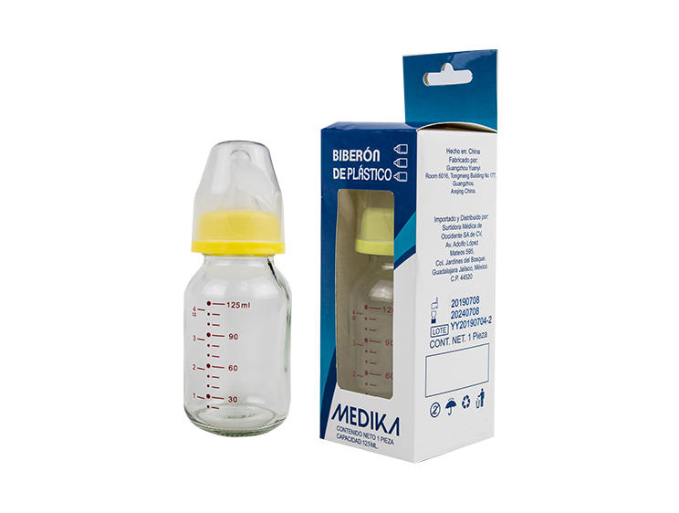Biberón de vidrio 120ML. Con tapa de rosca y capuchón protector
