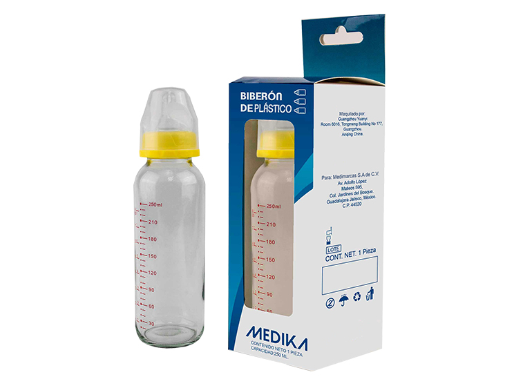 Biberón de vidrio 240ML. Con tapa de rosca y capuchón protector