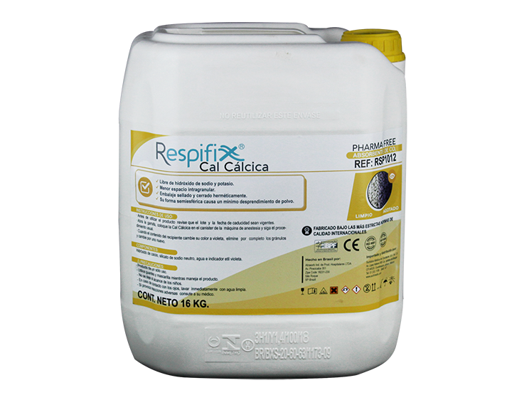 Cal cálcica con indicador de color, Pharma Free con 16 kg, cubeta de 19L. La cal cálcica de Resphifix Pharma Free grado médico, no contiene hidróxido de sodio ni hidróoxido de potasio lo que disminuye su reacción con Sevofluorano y con desfluorano, minimizando la formación de substancias tóxicas con el compuesto A. La Cal Cálcuca Respifix Pharma Free está indicada para utilizarse en pacientes que frecuentemente se someten a procedimientos quirúrgicos.