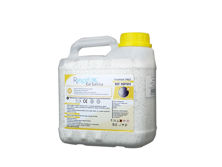 Cal cálcica con indicador de color, Pharma Free con 4.5 kg. La cal cálcica de Resphifix Pharma Free grado médico, no contiene hidróxido de sodio ni hidróoxido de potasio lo que disminuye su reacción con Sevofluorano y con desfluorano, minimizando la formación de substancias tóxicas con el compuesto A. La Cal Cálcuca Respifix Pharma Free está indicada para utilizarse en pacientes que frecuentemente se someten a procedimientos quirúrgicos.