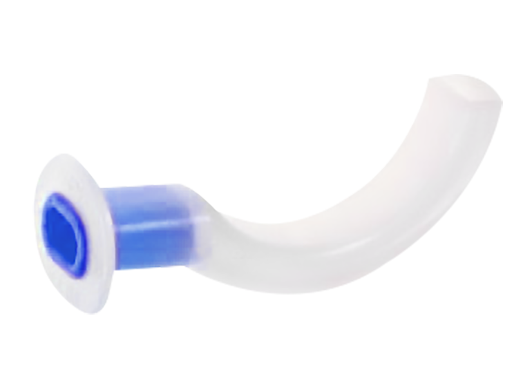 Cánula de Guedel (orofaríngea) AZUL No. 0 (50 mm). La cánula de Guedel (orofaríngea) es un dispositivo de material fabricado en PVC, que, introducido en la boca del paciente, evita el desplazamiento de la lengua hacia la vía aérea y la consiguiente obstrucción de la misma. La cánula de plástico es rígida, curva, con una pestaña reforzada en el extremo oral, de forma plana para asegurar que encaje perfectamente entre la lengua y el paladar duro.