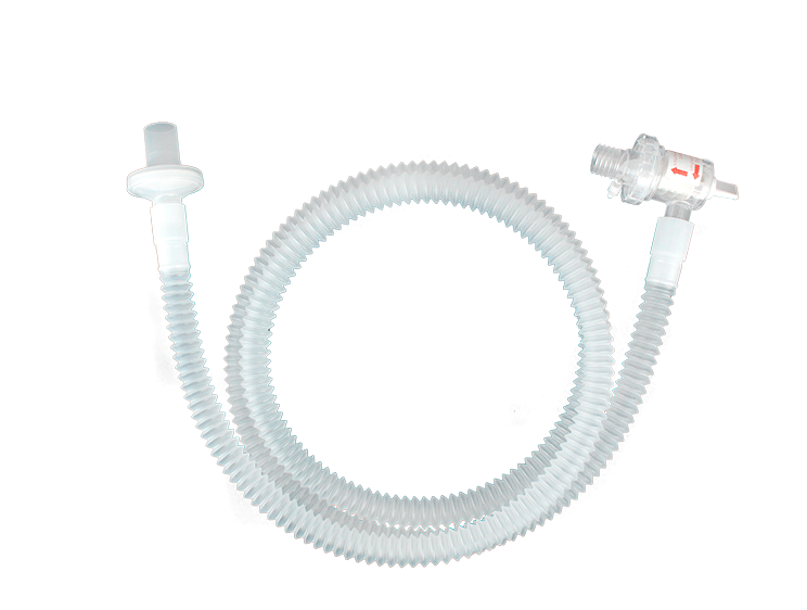 Circuito DE TRASLADO con válvula PEEP y puerto de supervisión, con tubería expandible 28″-96″(71-244cm) para uso en tomografías. Este circuito cuenta con válvula PEEP ajustable integrada, con un espacio muerto menor a 10ml y tubería expandible de 28” a 96”. Es el circuito ideal para el transporte, no cuenta con ningún complemento metálico por lo que no conduce electricidad, no interfiere en la radiofrecuencia; esto lo hace adecuado para las tomografías y la resonancia magnética.