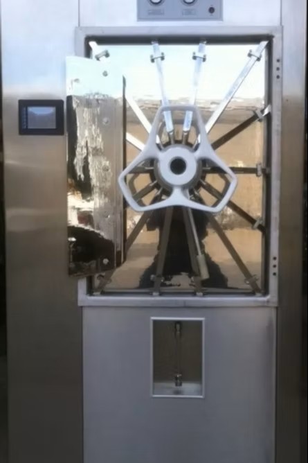 -Puerta radial fabricada en placa de 12.7 mm (1/2”) de espesor en acero inoxidable certificado tipo 304, de apertura manual con sistema de seguridad que impide su apertura en caso de existir presión el cámara de esterilización.