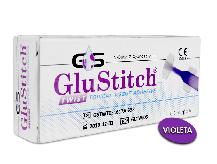 GluStitch Twist pegamento tisular a base de CIANOCRILATO, VIOLETA 0.5ml (caja c/6pzas). GluStitch Twist es un adhesivo tisular tópico, estéril, su fórmula está compuesta de monómero n-butil-2- cianoacrilato. Viene en un aplicador desechable empaquetado en una bolsa de aluminio protectora, permanece líquido hasta que se aplica a la piel para así extenderse en una capa delgada.