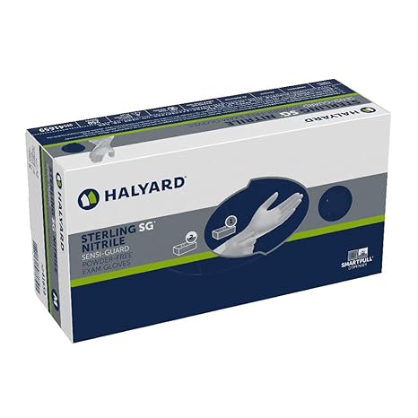 Guantes de nitrilo de examinacion Sterling Chicos. HALYARD Los guantes de examen sin polvo de nitrilo STERLING SG son libres de polvo y no estériles. Tienen puntas de los dedos texturizadas y son ambidiestros. No contienen polvo y tienen un puño de cuentas.