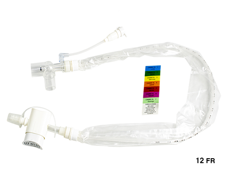 Sistema de succión cerrado ADULTO 12 FR simple PARA TUBOS ENDOTRAQUEALES DEL 6.0 Y 6.5 cuenta con válvula para accionar la succión con seguro giratorio y realizar broncoaspiraciones conector MDI y calcomanías de los días de la semana para poder realizar los cambios de sistema oportunamente. Cuenta con puerto de irrigación para realizar el lavado de la sonda.